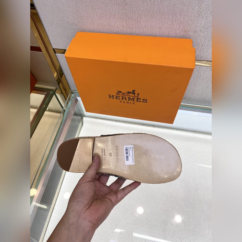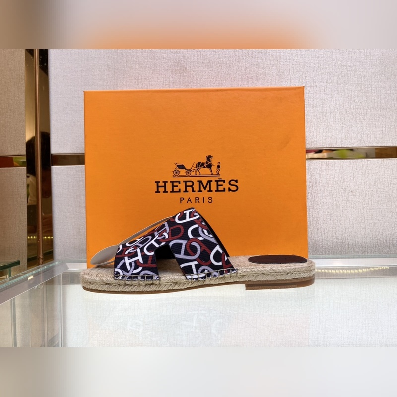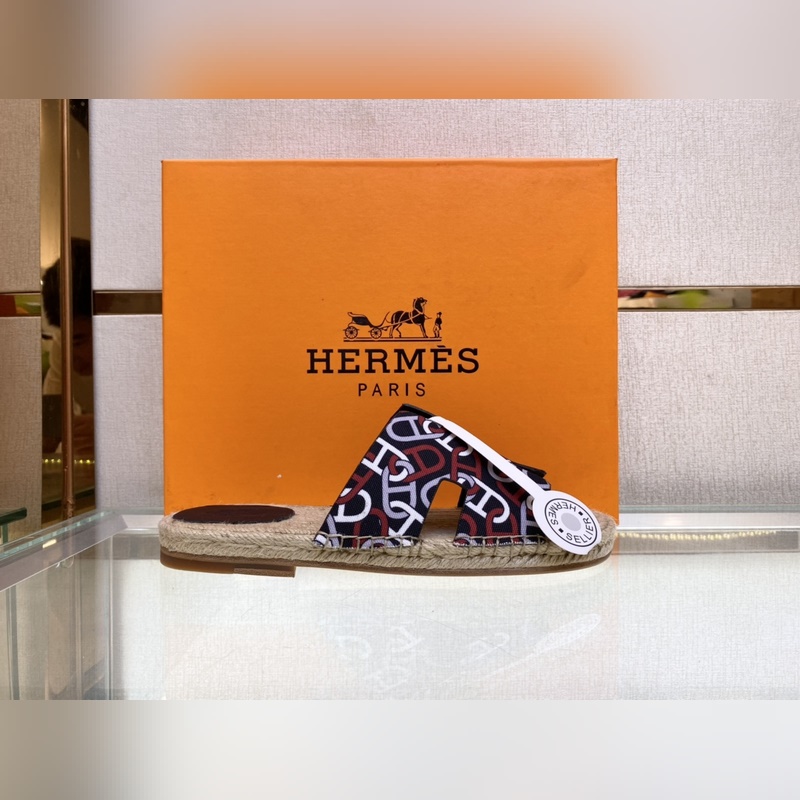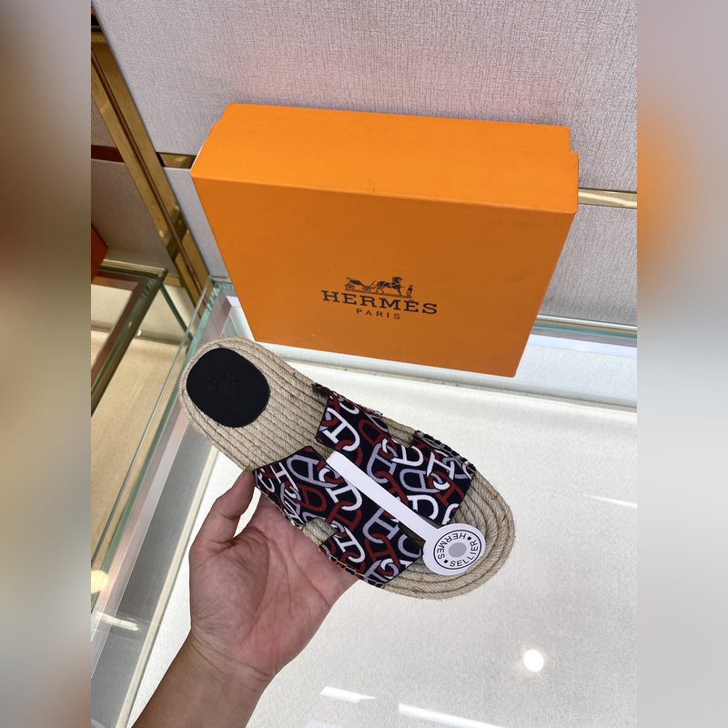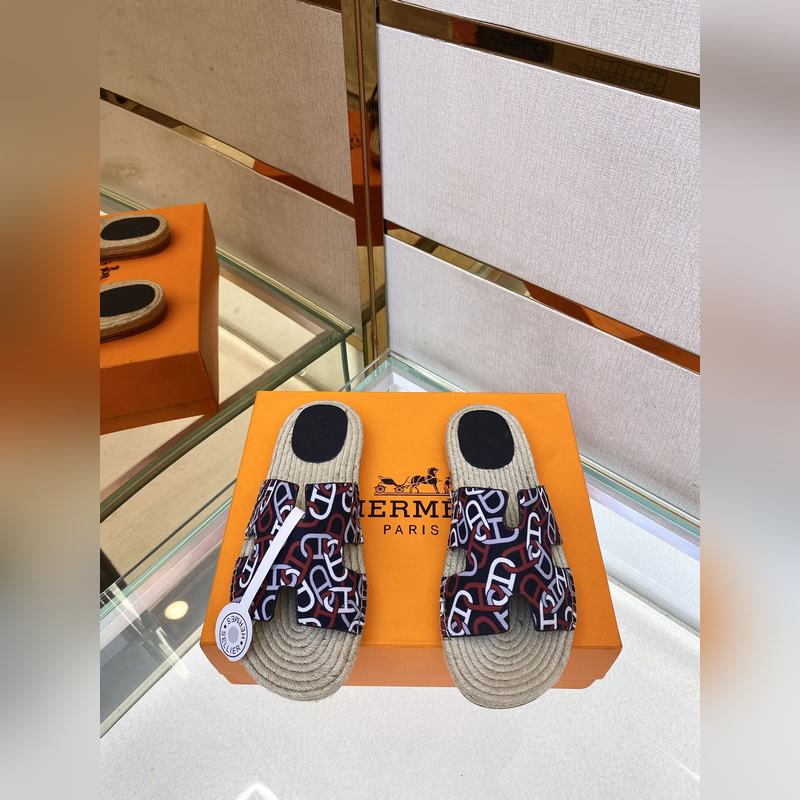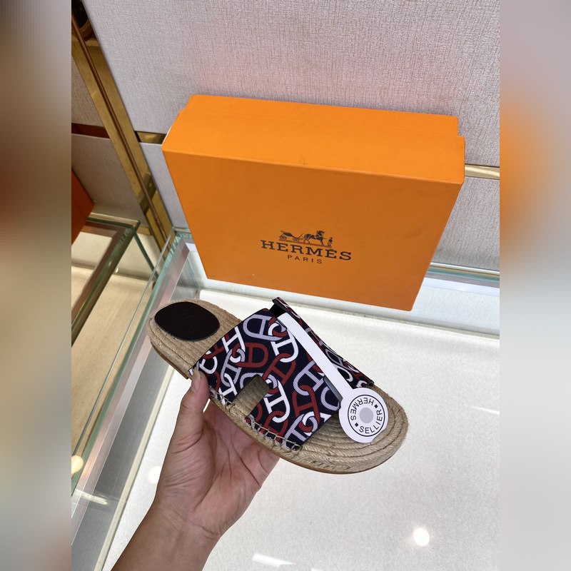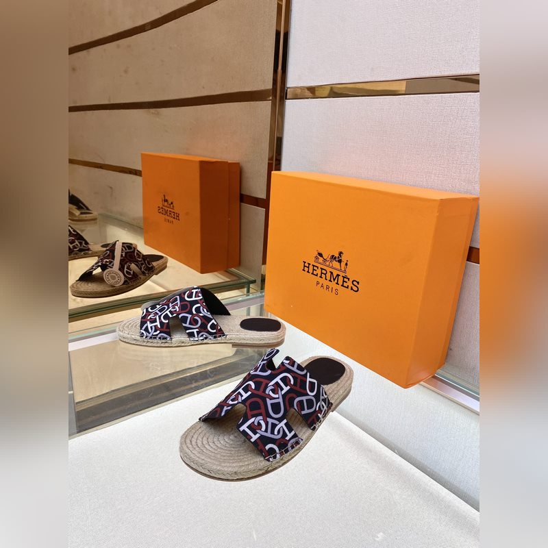 Chaussons Hermès Antigua 2022 en paille – Chaussons en paille et veau velours, semelles en cuir, semelles en corde tressée, tige en H, pour un look balnéaire décontracté. Pointures : 39-44 (38,45 sur mesure).