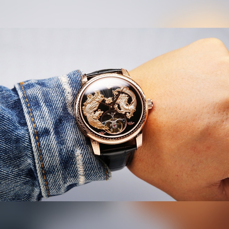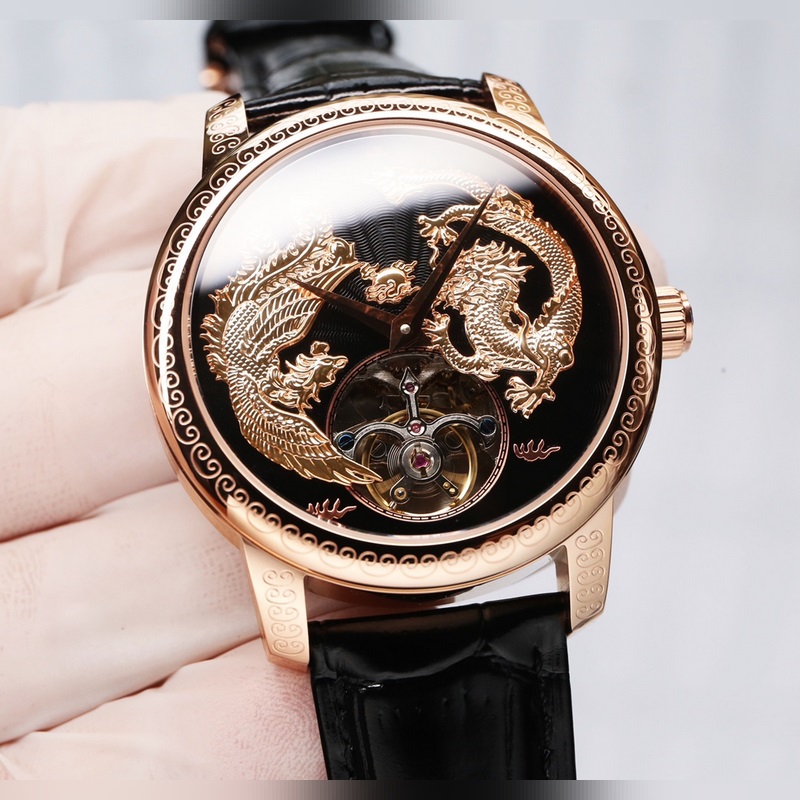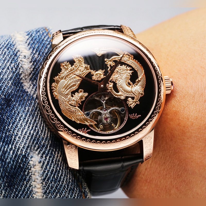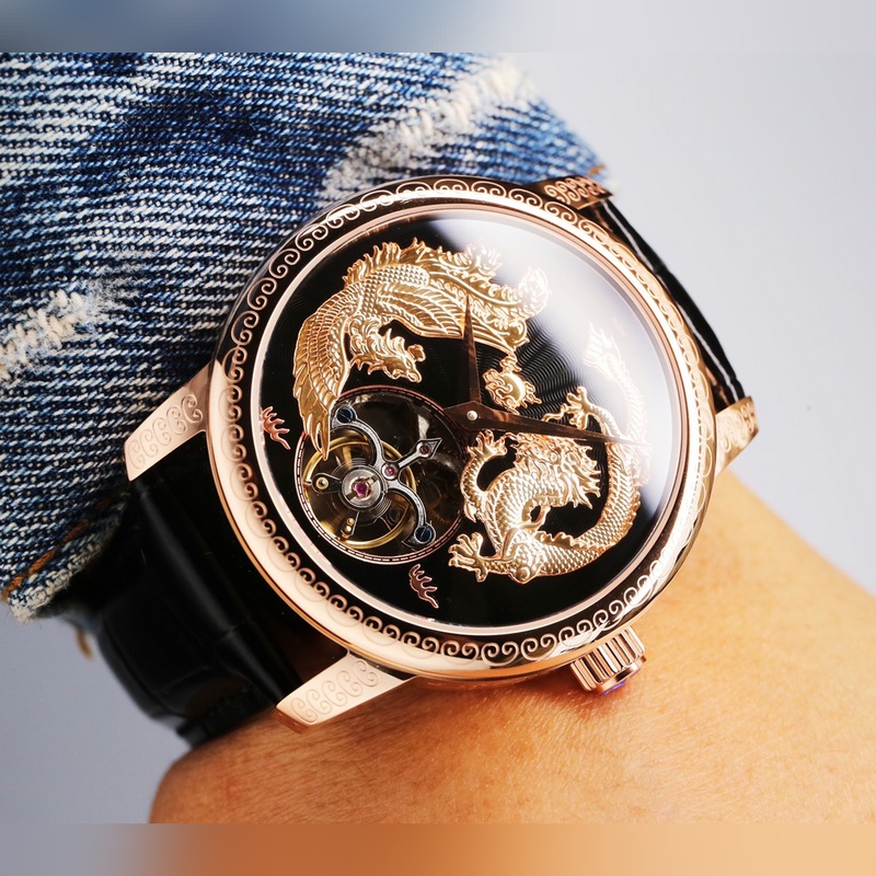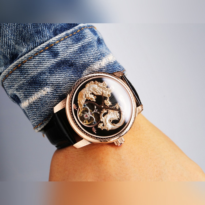 Le lancement de la montre tourbillon VACHERON CONSTANTIN TRADITIONNELLE édition limitée 6040T/000R témoigne de la reconnaissance des artisans de Vacheron Constantin pour le savoir-faire traditionnel à l’image du dragon et du phénix. Des écailles de dragon aux plumes de phénix, chaque détail est parfaitement visible sous notre objectif. Le motif soleillé habituel du cadran est remplacé par des gravures gravées à la main, qui complètent les motifs du dragon et du phénix. Le dragon et le phénix jouant avec les perles symbolisent la noblesse et la chance. L’association des dragons et des phénix est synonyme de couple, d’harmonie et de beauté.